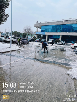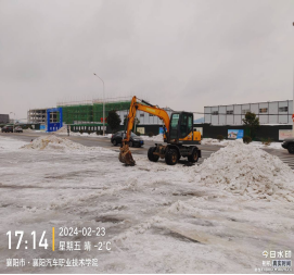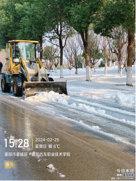 2024年2月21日我市遭遇强降雪天气,温度骤降,降雪量达10mm以上。为了保障返校备赛师生出行安全,后勤服务中心物业服务部战严寒,组织人员和机械对校园主干道的积雪进行了清理。