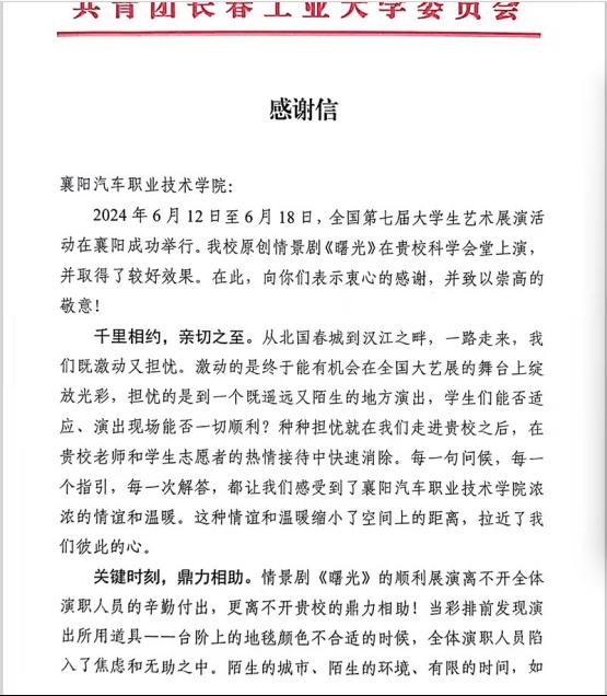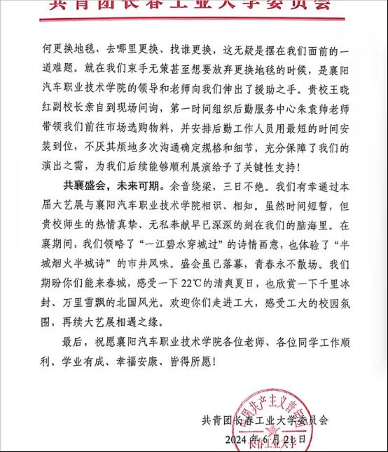 千里相约,亲切之至。近日,后勤服务中心收到来自北国春城长春工业大学的感谢信,为我校在大艺展期间提供的优质服务表示衷心的感谢和崇高的敬意!