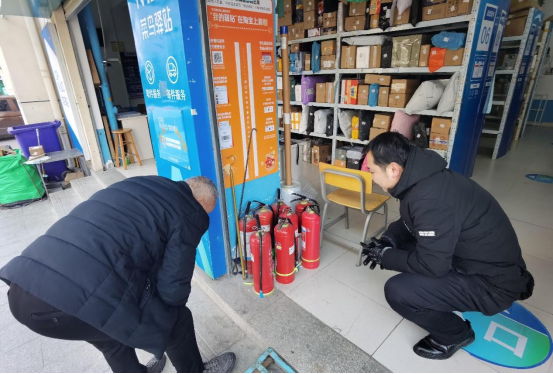 检查人员认真检查各门店的消防器具是否过期,发现有过期或即将过期的器具,责令立即整改。