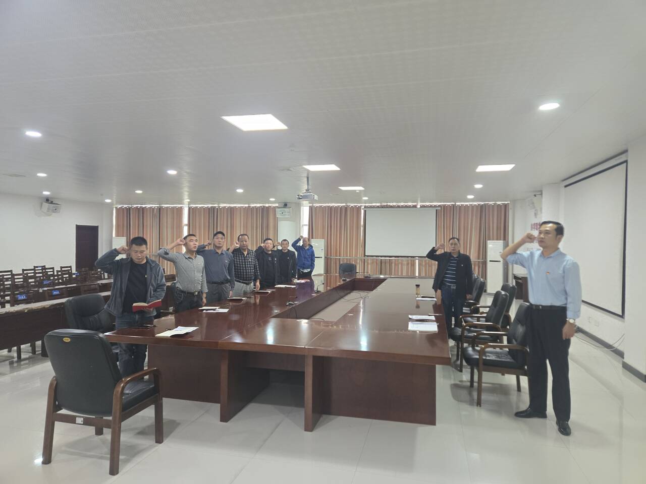 在回顾初心环节,大家奏唱国歌,重温入党誓词。
